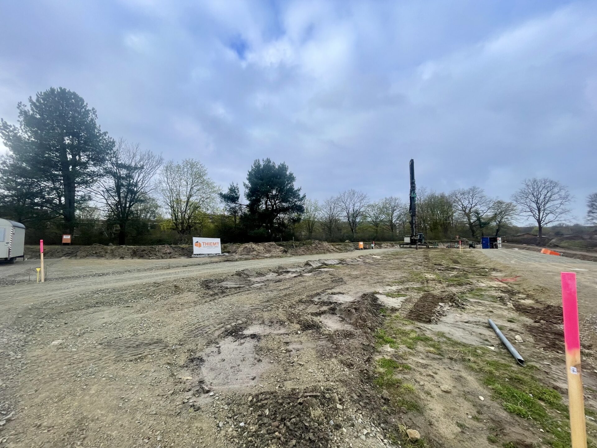 Auf dem Gelände ist der Erdbohrer im Einsatz: Dieser bohrt alle 60 cm ein ca. 4 bis 5 m tiefes Loch entlang des Hausgrundrisses. Dies erleichtert die Aufstellung der Spundwände.